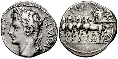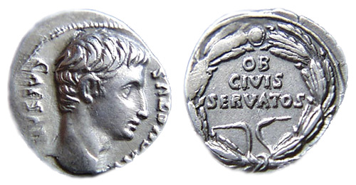 Verso: CONSENSVSENATETEQORDINPQR – Augusto, con corona d’alloro