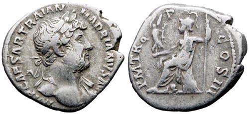Dritto: IMPCAESARTRAIANVSHADRIANVSAVGPMTRPCOSIII - Testa con corona