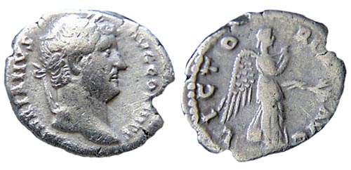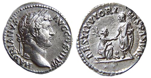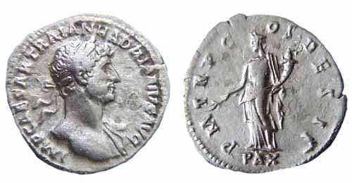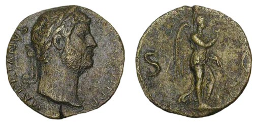 Dritto: HADRIANVSAVGVSTVS - Capo coronato d'alloro, Busto drappeggiato rivolto a destra.