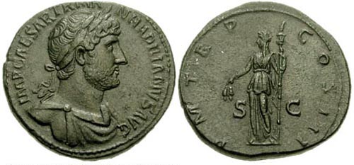 con cornucopia si stringe la mano con Hadrian a sinistra. 136
