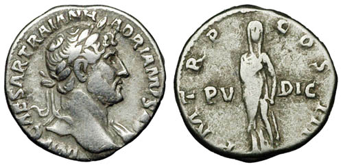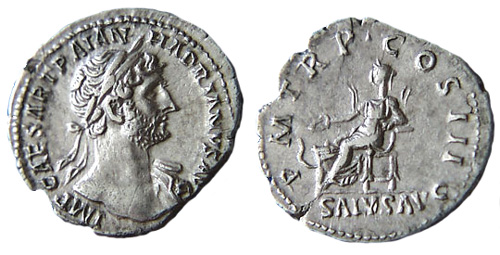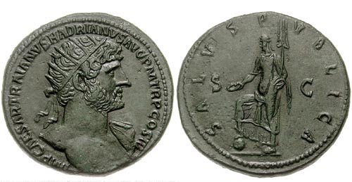 Dritto: HADRIANVSAVGCOSIIIPP - Capo coronato d'alloro, Busto drappeggiato rivolto a destra.