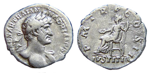 Dritto: IMPCAESARTRAIANHADRIANVSAVG - Capo coronato d'alloro, drappeggio,