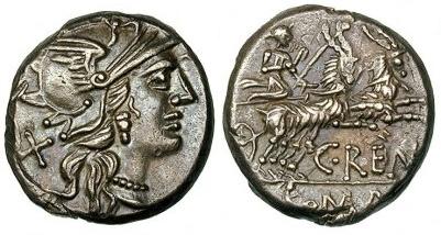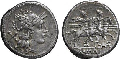 Testa di Roma a destra, con elmo attico alato. Dietro: X R I Dioscuri a cavallo verso destra. CN. DO - ROMA Ag Ø 17-19 mm 3,25-4,11 g