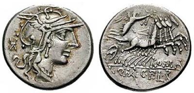 268 - Denario L. Coelius D Testa di Roma a destra, con