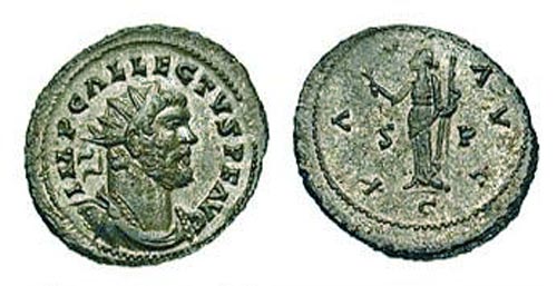 Dritto: IMPCALLECTVSPFAVG - Corona radiale, busto rivolto a