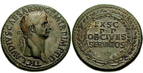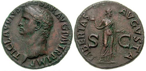 Dritto: TICLAVDCAESAVGAGRIPPAVGVSTA - Busto di Claudio con capo