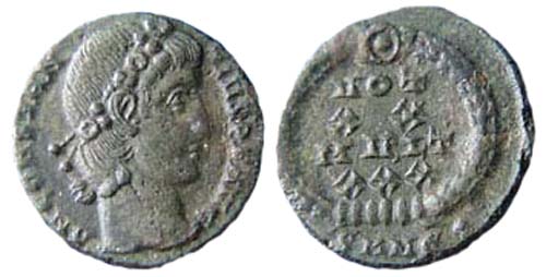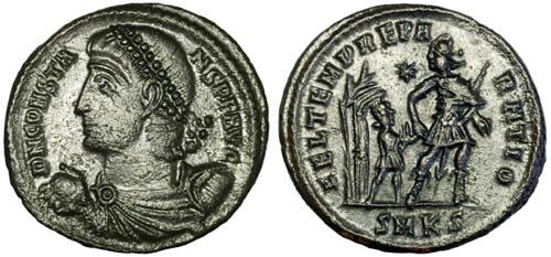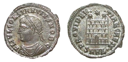 Verso: CONSTANTIVSCAESAR Exe: SMTS - Vittoria avanza a sinistra, con in mano una ghirlanda e una palma. 326