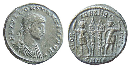 Dritto: FLIVLCONSTANTIVSNOBC -Testa coronata d'alloro, drappeggio e corazza con