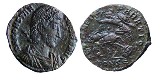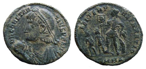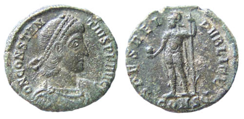 piedi rivolto a sinistra, con labarum e lancia, viene incoronato dalla Vittoria. 350