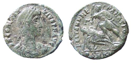 Imperatore in piedi rivolto a sinistra, con globo e lancia. 355-361 (Sirmium).