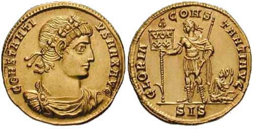 Costanzo in piedi rivolto a sinistra, con due stendardi, ognuno con Chi-Rho