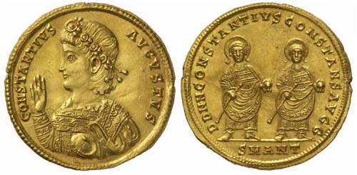- Costantinus II in piedi, frontalmente, Con stendardo legionario sormontato da