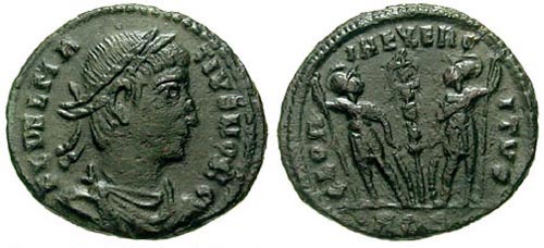 Due soldati in piedi ai lati di uno stendardo. 336-337 (Cyzicus).