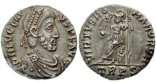Verso: VICTORIAAVGG Exe: M/D/COM - Eugenius e Theodosius I seduti, frontalmente,
