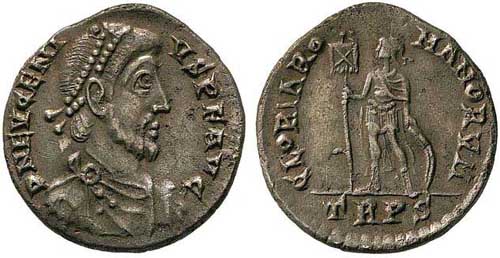 Verso: GLORIAROMANORVM Exe: TRPS - Eugenio in piedi rivolto a sinistra, con labarum
