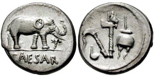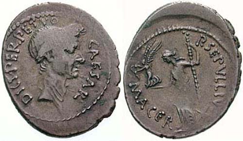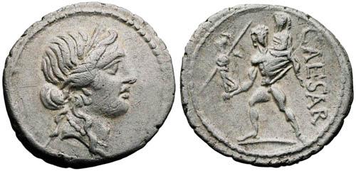 Dritto: Testa velata e coronata d'alloro di Giulio Cesare rivolta a destra.