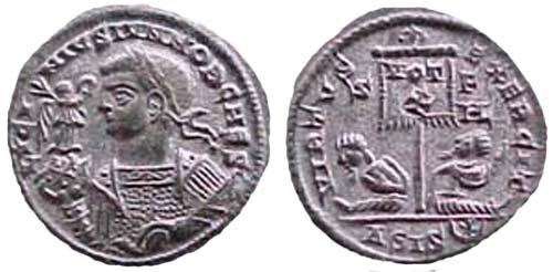 piedi, a sinistra , un'aquila con ghirlanda nel becco, a destra, un prigioniero. 321-324