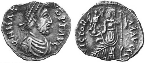 Verso: VICTORAAAVGGG - Roma seduta rivolta a sinistra, con scettro e Vittoria su