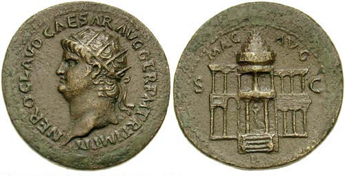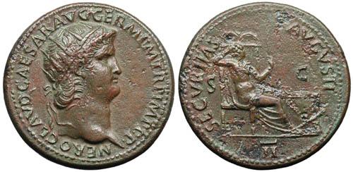 Dritto: IMPNEROCLAVDCAESARAVGGERPMTRPPP - Testa con corona radiale rivolta a