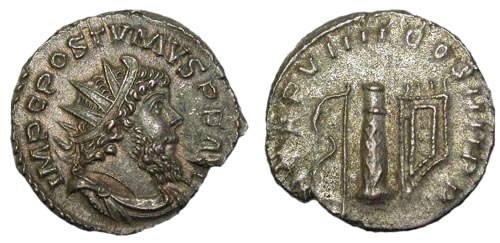 Verso: PMTRPCOSIIPP - Postumus in piedi rivolto a sinistra, su globo e lancia. 261