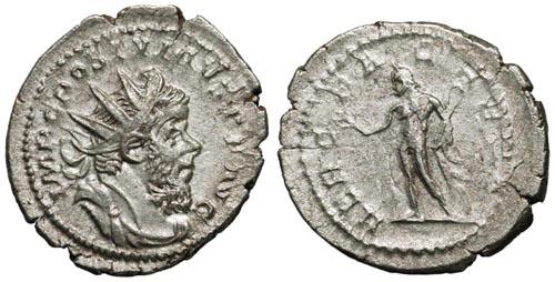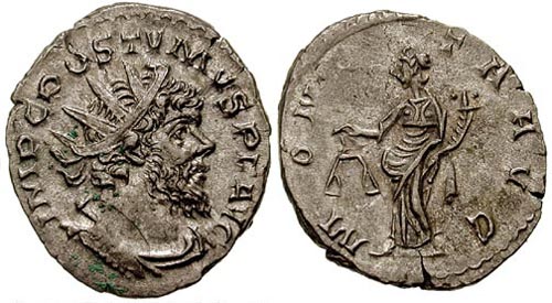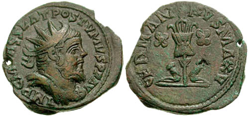 Verso: SAECVLIFELICITAS - Postumus in piedi rivolto a destra, con lancia e