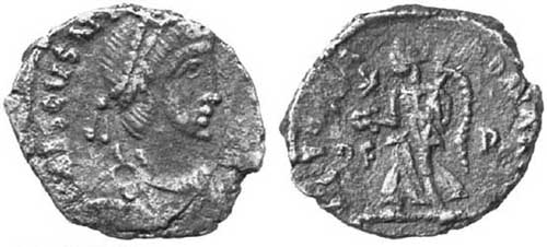 Verso: VICTORIAROMANORVM - Vittoria avanza a sinistra e con ghirlanda. 409-411