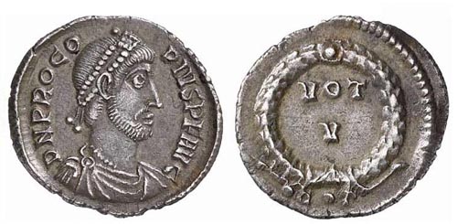 Dritto: DNPROCOPIVSPFAVG - Capo diademato e busto con corazza rivolto a destra.