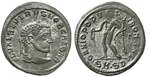 Dritto: FLVALSEVERVSNOBC - Testa coronata d'alloro, corazza e busto rivolto a