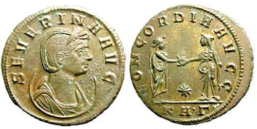 Dritto: SEVERINAAVG - Testa diademata. drappeggio e busto rivolto a destra.