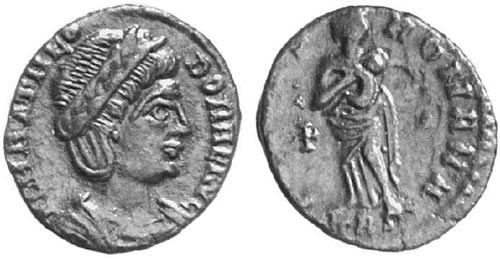 Dritto: FLMAXTHEODORAEAVG - Testa diademata. drappeggio e busto rivolto a