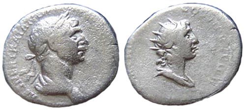 Verso: DIVINERVAETTRAIANVSPAT - , Capo coronato d'alloro di Nerva con busto rivolto verso destra, di