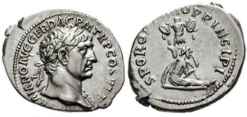 Verso: SENATVSPOPVLVQVEROMANVS Exe: SC - Due trofei sopra. 115-117 (Roma).