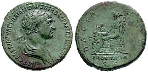 Dritto: IMPCAESNERTRAIANOOPTIMOAVGGERDAC - Capo coronato d'alloro,