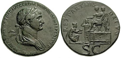Dritto: IMPCAESNERTRAIANOOPTIMOAVGGERDACPARTHICOPMTRPCOSVIPP -Capo coronato