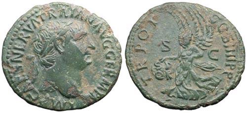 Dritto: IMPCAESNERVATRAIANAVG - Capo coronato d'alloro rivolta a destra.