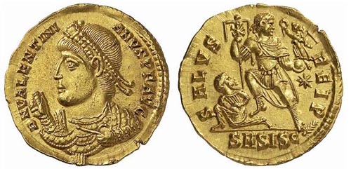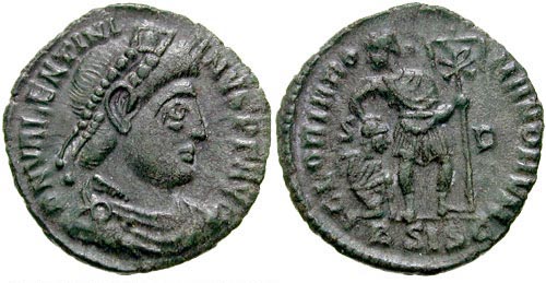 - Valentiniano I in piedi frontalmente, con labarum e Vittoria su globo.