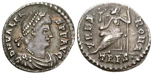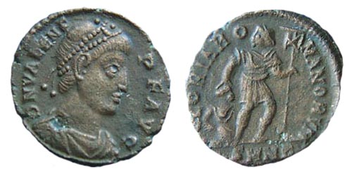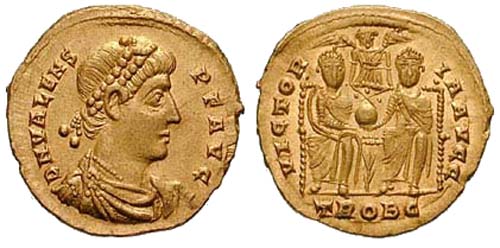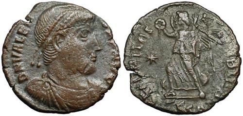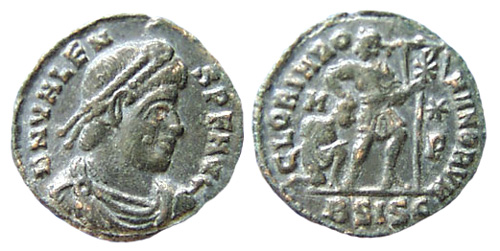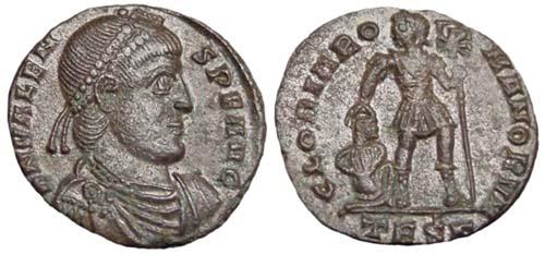 - Valens in piedi, frontalmente, con labarum e Vittoria su globo.