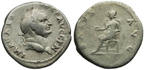 Verso: PONTIFMAXIM - Vespasiano seduto rivolto a destra, con in mano