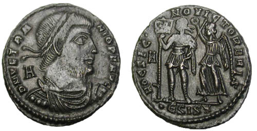 piedi rivolto a sinistra con in mano labarum e lancia; viene incoronato dalla