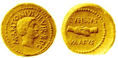 Marc'Antonio a destra. M. ANTONIVS. AVG. IMP. IIII. COS. TERT. III. VIR. R. P.