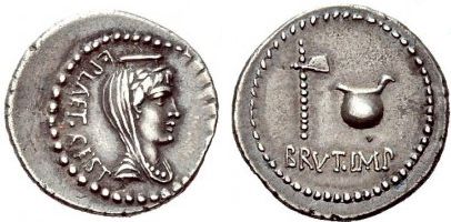 Testa velata e laureata di Giulio Cesare a destra. Davanti il lituus; dietro l'apex.