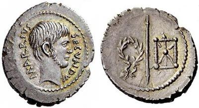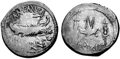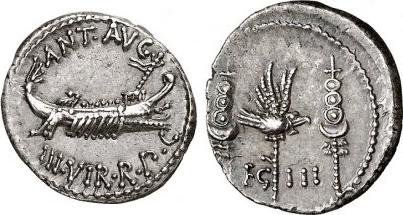 tra due insegne militari (signa). LEG XIX Ag Ø 17-19 mm 2,92-3,81 g 32-31 a.C.