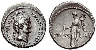 destra. M. ANTONIVS. AVG. IMP. IIII. COS. TERT. III. VIR. R. P. C R La Vittoria stante a sinistra; tiene la corona vittata con la mano