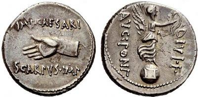 D Mano destra a palmo aperto. IMP. CAESARI - SCARPVS. IMP (oppure IMP)